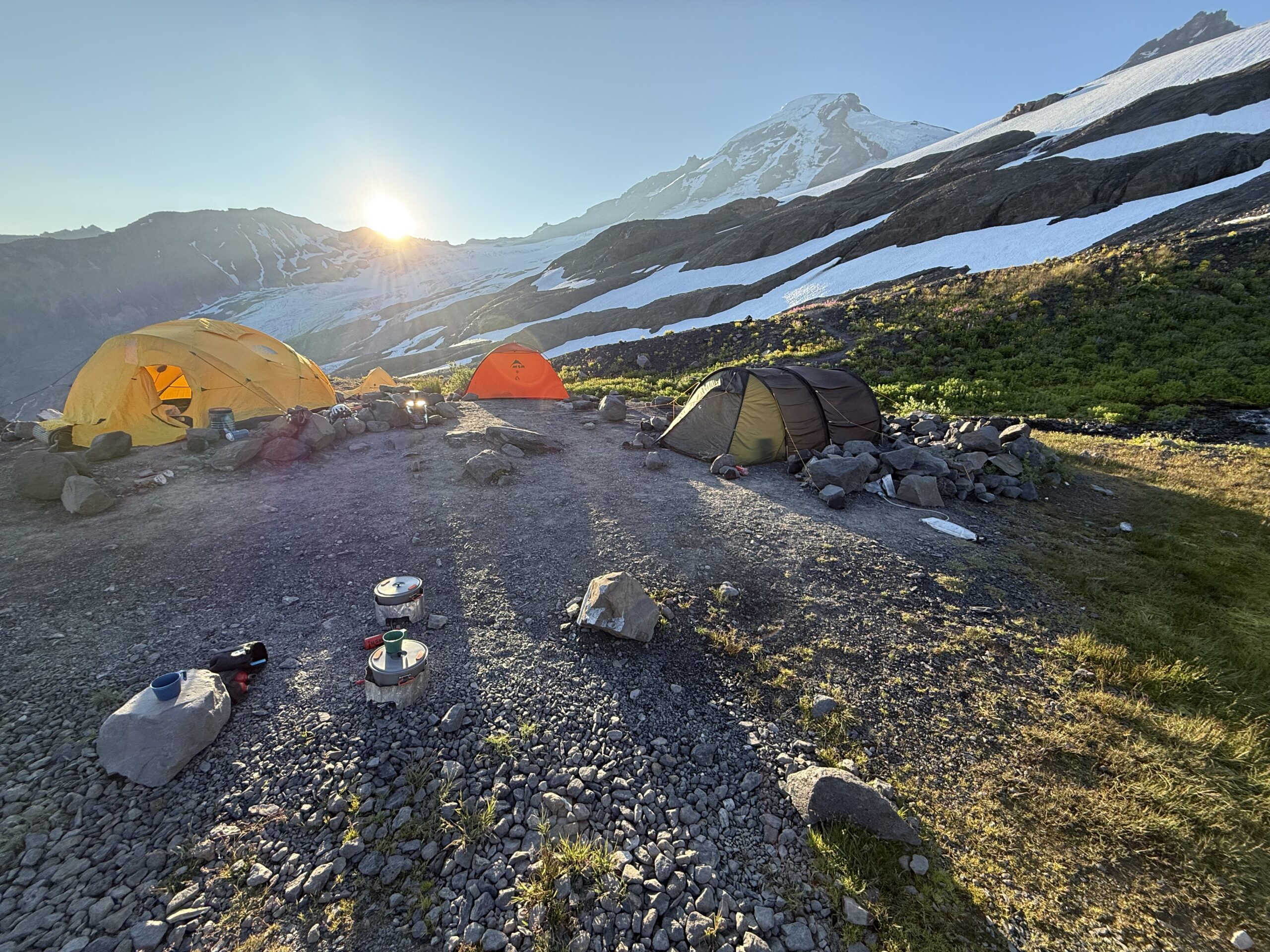 Later that morning I woke to the scene I captured in the picture above. The question in my spirit was, how do I process what had just happened? I struggled with the disappointment of having trained so hard and yet come up short of my goal. I stood looking up at the summit, yearning to be up there with the team and capturing that photo at the top that I so longed to have framed in my office. As I stood with my gaze fixed on the summit, questioning what I could’ve done differently or how yesterday could have gone more according to plan, the brilliant warmth of the sun finally got my attention. I looked away from the summit for a moment and began to take in the grandeur of the place where I was standing. Slowly my heart, and my attitude began to change. I was alone in base camp with only the sound of the numerous streams bubbling their way out of the base of the glaciers and winding through spectacular meadows of brilliant wildflowers, finally disappearing over the crest of the ridge we had climbed the day before. I scrambled, gingerly, up on a small ridge above our camp and did a slow 360° look at the place that I was standing. I don’t believe I’ve ever stood in a more spectacular place on a more beautiful morning. Could it be, could it just be that this is what God had for me all along? Did I have the faith in God‘s plan for my life to embrace this moment as the true goal of all my work and preparation? Or would the disappointment of not making it to the summit rob me of the richness of this moment? In the end, if this was God‘s great gift for me, if this was his plan all along to create this moment to commune with me, to open up to me the magnificence of his incredible creation, to spend this morning just with me in deep fellowship, if that was truly the purpose of all that I had prepared for, would that be enough?